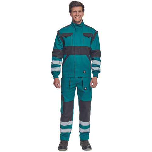 • férfi cipzáras munkakabát levehető újakkal • 2 első zseb • 2 mellzseb • megerősítés a váll és könyök részeken • rugalmas mandzsetta és alsó derékszegély • fényvisszavető csíkok az ujjakon és a kabát hátán, anyag: 100% pamut, anyagvastagság: 260 g/m2