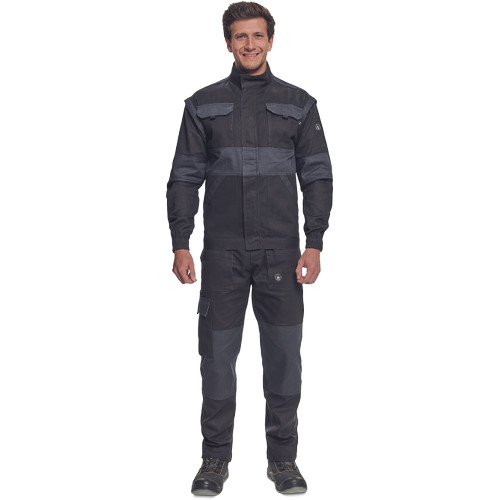 • férfi cipzáras munkakabát levehető ujjakkal • 2 oldalzseb, 2 mellzseb • megerősítés a váll- és könyökrészeken • rugalmas mandzsetta és derékpánt • anyag: 100% pamut, anyagvastagság: 260 g/m2