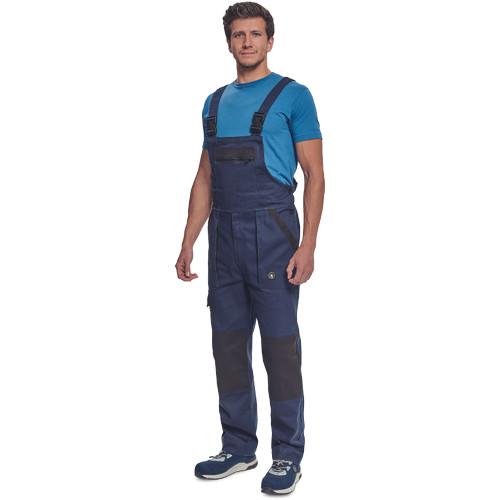 • férfi mellesnadrág rugalmas derékkal, széles pántokkal, műanyag csatokkal • 2 első zseb, 1 oldalzseb, 1 nagy mellzseb, 2 hátsó zseb • megerősített térdrész • leengedhető szárak