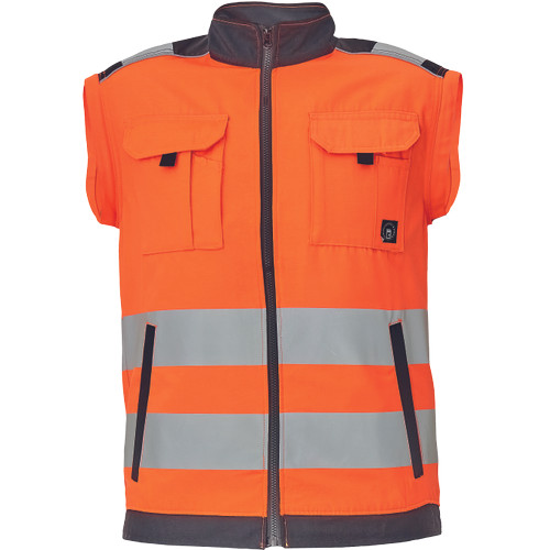 • férfi HI-VIS cipzáras munkakabát levehető ujjakkal • 2 oldalzseb • 2 mellzseb • Oxford 600D megerősítés a váll-és könyökrészeken • 7 cm-es nyomtatott fényvisszavető csík az ujjakon és a test körül derékrészen • rugalmas mandzsetta és alsó szegély • 2 kisebb fényvisszavető csík a vállakon • fényvisszavető szegés