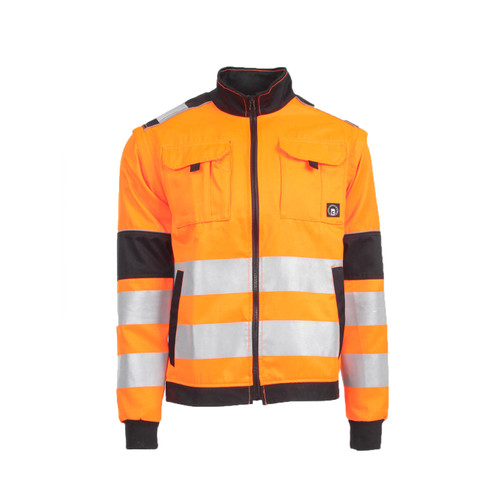 • férfi HI-VIS cipzáras munkakabát levehető ujjakkal • 2 oldalzseb • 2 mellzseb • Oxford 600D megerősítés a váll-és könyökrészeken • 7 cm-es nyomtatott fényvisszavető csík az ujjakon és a test körül derékrészen • rugalmas mandzsetta és alsó szegély • 2 kisebb fényvisszavető csík a vállakon • fényvisszavető szegés