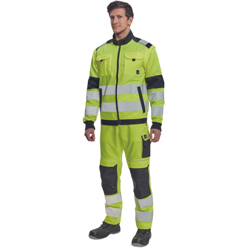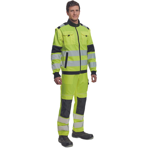 • férfi HI-VIS cipzáras munkakabát levehető ujjakkal • 2 oldalzseb • 2 mellzseb • Oxford 600D megerősítés a váll-és könyökrészeken • 7 cm-es nyomtatott fényvisszavető csík az ujjakon és a test körül derékrészen • rugalmas mandzsetta és alsó szegély • 2 kisebb fényvisszavető csík a vállakon • fényvisszavető szegés
