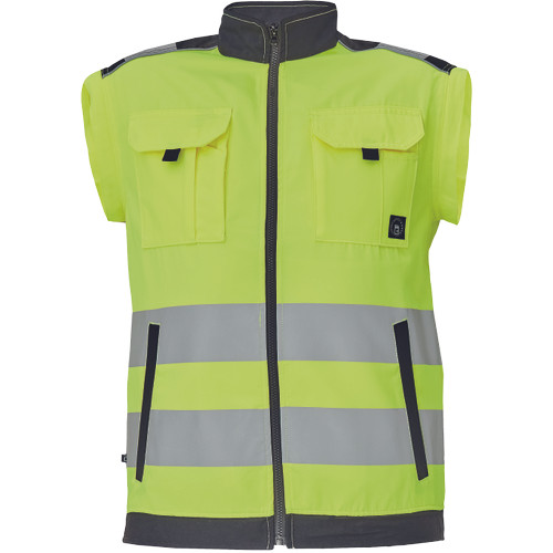 • férfi HI-VIS cipzáras munkakabát levehető ujjakkal • 2 oldalzseb • 2 mellzseb • Oxford 600D megerősítés a váll-és könyökrészeken • 7 cm-es nyomtatott fényvisszavető csík az ujjakon és a test körül derékrészen • rugalmas mandzsetta és alsó szegély • 2 kisebb fényvisszavető csík a vállakon • fényvisszavető szegés