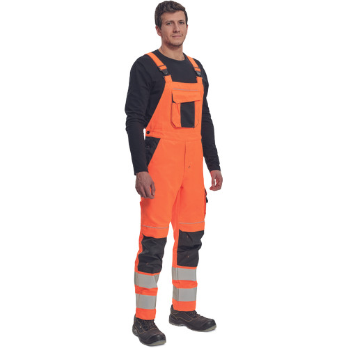 • férfi HI-VIS mellesnadrág rugalmas derékkal, széles pántokkal, műanyag csatokkal • 2 első zseb, 1 oldalzseb, 1 nagy mellzseb, 2 hátsó zseb • 2 kis hátsó zseb a jobb combon • nyomtatott 7,5 cm-es fényvisszavető csík a szárak alján • fényvisszavető szegés • Oxford 600D megerősített térdrész, térdpárna tartó • meghosszabbítható szárak