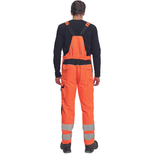 • férfi HI-VIS mellesnadrág rugalmas derékkal, széles pántokkal, műanyag csatokkal • 2 első zseb, 1 oldalzseb, 1 nagy mellzseb, 2 hátsó zseb • 2 kis hátsó zseb a jobb combon • nyomtatott 7,5 cm-es fényvisszavető csík a szárak alján • fényvisszavető szegés • Oxford 600D megerősített térdrész, térdpárna tartó • meghosszabbítható szárak