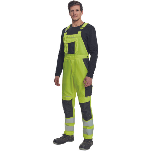 • férfi HI-VIS mellesnadrág rugalmas derékkal, széles pántokkal, műanyag csatokkal • 2 első zseb, 1 oldalzseb, 1 nagy mellzseb, 2 hátsó zseb • 2 kis hátsó zseb a jobb combon • nyomtatott 7,5 cm-es fényvisszavető csík a szárak alján • fényvisszavető szegés • Oxford 600D megerősített térdrész, térdpárna tartó • meghosszabbítható szárak