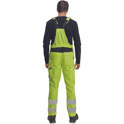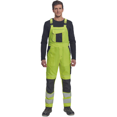 • férfi HI-VIS mellesnadrág rugalmas derékkal, széles pántokkal, műanyag csatokkal • 2 első zseb, 1 oldalzseb, 1 nagy mellzseb, 2 hátsó zseb • 2 kis hátsó zseb a jobb combon • nyomtatott 7,5 cm-es fényvisszavető csík a szárak alján • fényvisszavető szegés • Oxford 600D megerősített térdrész, térdpárna tartó • meghosszabbítható szárak