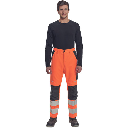 • férfi HI-VIS munkanadrág rugalmas derékkal • 2 első zseb, 1 oldalzseb a bal száron, 2 hátsó zseb • 2 kis hátsó zseb a jobb száron • nyomtatott 7,5 cm-es fényvisszavető csíkok a szárak alsó részén • fényvisszavető szegés • Oxford 600D megerősített térdrész, térdvédőtartó • leengedhető szárak