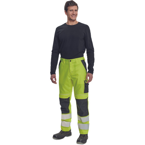• férfi HI-VIS munkanadrág rugalmas derékkal • 2 első zseb, 1 oldalzseb a bal száron, 2 hátsó zseb • 2 kis hátsó zseb a jobb száron • nyomtatott 7,5 cm-es fényvisszavető csíkok a szárak alsó részén • fényvisszavető szegés • Oxford 600D megerősített térdrész, térdvédőtartó • leengedhető szárak