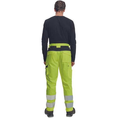 • férfi HI-VIS munkanadrág rugalmas derékkal • 2 első zseb, 1 oldalzseb a bal száron, 2 hátsó zseb • 2 kis hátsó zseb a jobb száron • nyomtatott 7,5 cm-es fényvisszavető csíkok a szárak alsó részén • fényvisszavető szegés • Oxford 600D megerősített térdrész, térdvédőtartó • leengedhető szárak