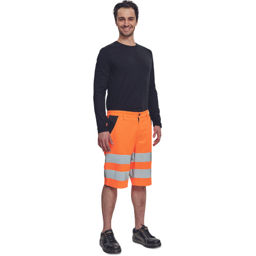 • férfi HI-VIS rövidnadrág rugalmas derékkal • 2 első zseb, 2 hátsó zseb • két 7 cm-es nyomtatott fényvisszavető csík a comb körül • fényvisszavető szegés