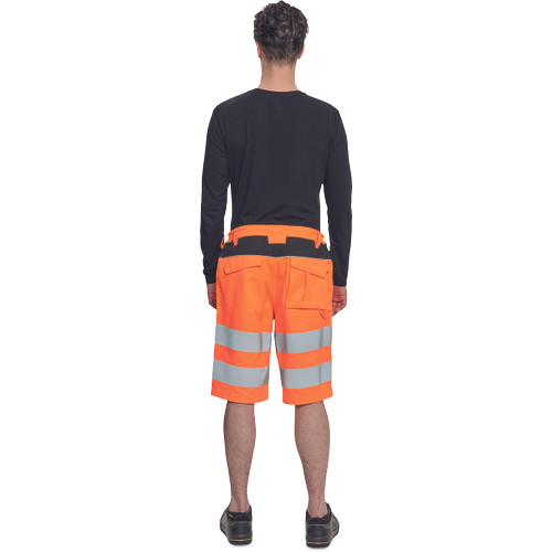 • férfi HI-VIS rövidnadrág rugalmas derékkal • 2 első zseb, 2 hátsó zseb • két 7 cm-es nyomtatott fényvisszavető csík a comb körül • fényvisszavető szegés
