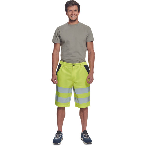 • férfi HI-VIS rövidnadrág rugalmas derékkal • 2 első zseb, 2 hátsó zseb • két 7 cm-es nyomtatott fényvisszavető csík a comb körül • fényvisszavető szegés