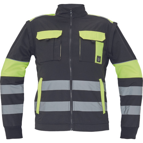 • cipzáras férfi munkakabát, levehető ujjakkal • 2 oldalzsebbel, 2 mellzsebbel készül, a a váll- és a könyökrészen megerősítő rátétekkel • rugalmas mandzsetta és alsó szegély • derékrészen, az ujjakon és a vállakon rávarrt fényvisszavető csíkokkal