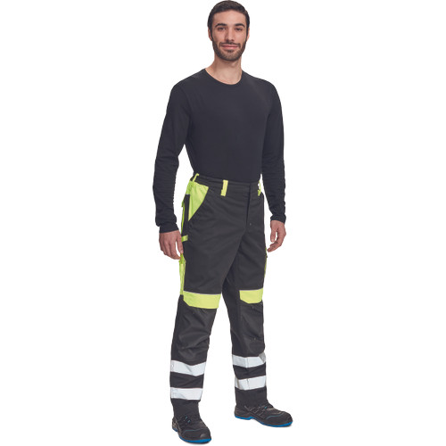 • férfi munkanadrág rugalmas derékkal, meghosszabítható szárakkal • 1 nagy mellzsebbel, 2 első zsebbel, a bal száron 1 dupla zsebbel • a jobb száron 2 kisebb hátsó zsebbel, hátul 2 zsebbel készül • az alsó szárakon két rávarrt fényvisszavető csíkkal van ellátva • megerősített térdrész és térdzseb Oxford 600D anyagból térdvédő behelyezéséhez