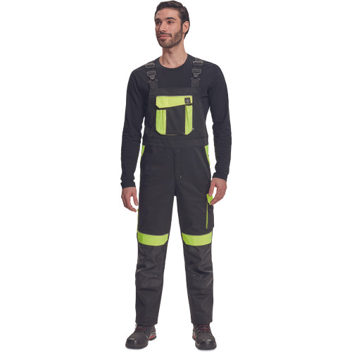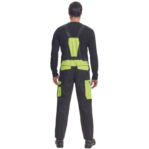 • férfi mellesnadrág rugalmas derékkal, széles pántokkal, műanyag csatokkal • 2 első zseb, 1 oldalzseb, 1 nagy mellzseb, 2 hátsó zseb • 2 kis hátsó zseb a jobb száron • fényvisszavető szegés • Oxford 600D megerősített térdrész, térdvédőtartó • leengedhető szárak