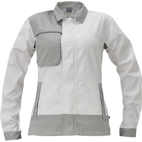 • női munkakabát pamut-PES kevertszálas anyagból • nőies szabás • dekoratív paszpol kontrasztos színekben • hálós betétek • fedett cipzár és zsebek • 2 oldalzseb • 1 mellzseb, benne rejtett D-gyűrűvel • ipari mosásra alkalmas • lehetőség az azonosító chip beillesztésére