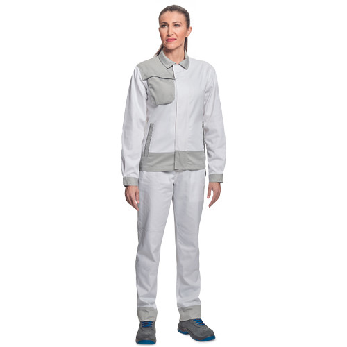 • női munkakabát pamut-PES kevertszálas anyagból • nőies szabás • dekoratív paszpol kontrasztos színekben • hálós betétek • fedett cipzár és zsebek • 2 oldalzseb • 1 mellzseb, benne rejtett D-gyűrűvel • ipari mosásra alkalmas • lehetőség az azonosító chip beillesztésére