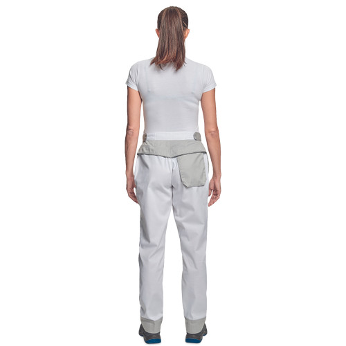 • női munkanadrág könnyű pamut-PES kevertszálas anyagból • dekoratív paszpol kontrasztos színekkel • légáteresztő, köszönhetően hálós betéteknek • teljesen fedett cipzár és zsebek • a derékbőség állítható az oldalán található tépőzárnak köszönhetően • a nadrágszárak hossza 5 cm-rel eghosszabbítható • 2 oldalsó zseb, az egyikben D-gyűrű található • 1 hátsó zseb • tartós anyagú • puhább, hajlékonyabb szövet