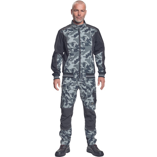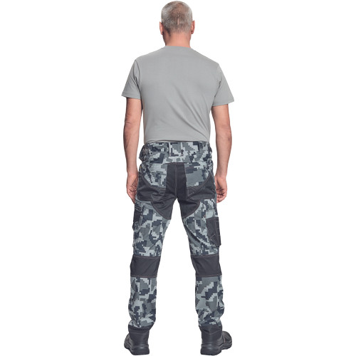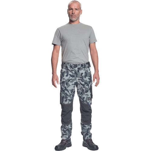 férfi munkanadrág innovatív, rugalmas TRIFIBETEX® anyagból, CORDURA® betétekkel digitális terepmintával, elöl 2 ékzseb, hátul 2 tépőzáras foltzseb, bal oldalt nagy multifunkciós zseb, jobb oldalt multifunkciós vonalzó, kés és ceruzatartó, fém "D" gyűrű, rugalmas derék, hosszabbítható szárhossz, fényvisszavető elemek, dekoratív tripla varrás kontrasztos színnel, kalapácstartó