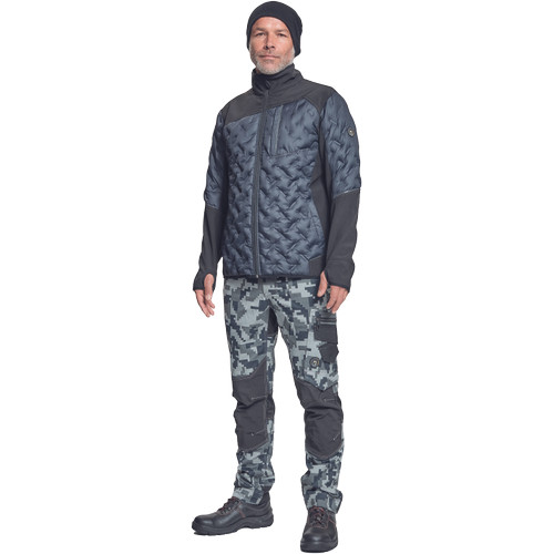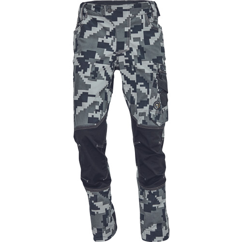 férfi munkanadrág innovatív, rugalmas TRIFIBETEX® anyagból, CORDURA® betétekkel digitális terepmintával, elöl 2 ékzseb, hátul 2 tépőzáras foltzseb, bal oldalt nagy multifunkciós zseb, jobb oldalt multifunkciós vonalzó, kés és ceruzatartó, fém "D" gyűrű, rugalmas derék, hosszabbítható szárhossz, fényvisszavető elemek, dekoratív tripla varrás kontrasztos színnel, kalapácstartó