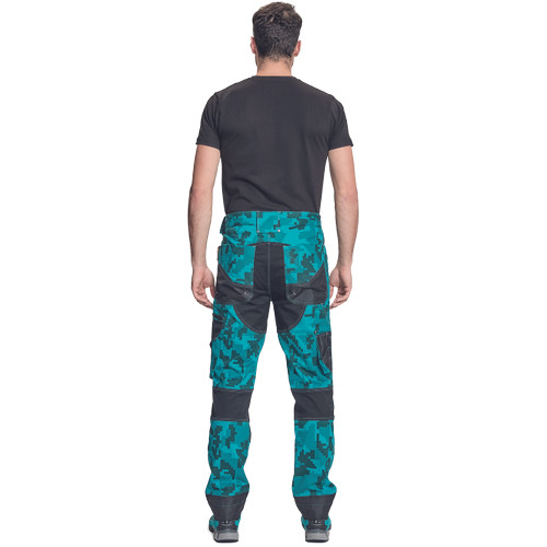 férfi munkanadrág innovatív, rugalmas TRIFIBETEX® anyagból, CORDURA® betétekkel digitális terepmintával, elöl 2 ékzseb, hátul 2 tépőzáras foltzseb, bal oldalt nagy multifunkciós zseb, jobb oldalt multifunkciós vonalzó, kés és ceruzatartó, fém "D" gyűrű, rugalmas derék, hosszabbítható szárhossz, fényvisszavető elemek, dekoratív tripla varrás kontrasztos színnel, kalapácstartó