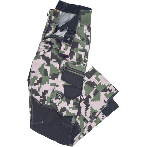 férfi munkanadrág innovatív, rugalmas TRIFIBETEX® anyagból, CORDURA® betétekkel digitális terepmintával, elöl 2 ékzseb, hátul 2 tépőzáras foltzseb, bal oldalt nagy multifunkciós zseb, jobb oldalt multifunkciós vonalzó, kés és ceruzatartó, fém "D" gyűrű, rugalmas derék, hosszabbítható szárhossz, fényvisszavető elemek, dekoratív tripla varrás kontrasztos színnel, kalapácstartó