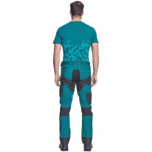 • férfi munkanadrág innovatív rugalmas Trifibetex® anyagból CORDURA® betétekkel • elöl 2 ékzseb • hátul 2 tépőzáras foltzseb • bal oldalon nagy multifunkciós zseb • jobb oldalon multifunkciós zseb vonalzónak • kés- és ceruzatartó • fém "D" gyűrű • rugalmas derék• hosszabbítható szárak • fényvisszavető részletek • dekoratív tripla tűzés kontrasztos színnel • kalapácstartó