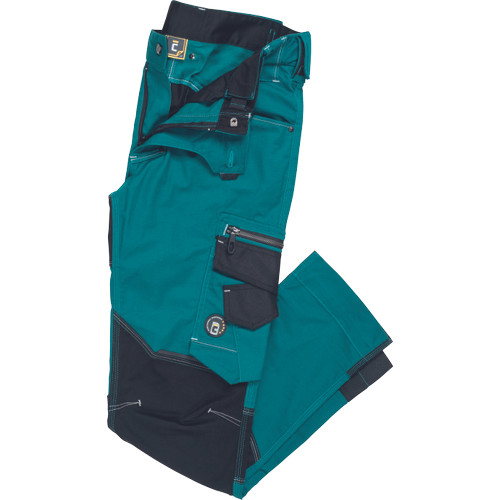 • férfi munkanadrág innovatív rugalmas Trifibetex® anyagból CORDURA® betétekkel • elöl 2 ékzseb • hátul 2 tépőzáras foltzseb • bal oldalon nagy multifunkciós zseb • jobb oldalon multifunkciós zseb vonalzónak • kés- és ceruzatartó • fém "D" gyűrű • rugalmas derék• hosszabbítható szárak • fényvisszavető részletek • dekoratív tripla tűzés kontrasztos színnel • kalapácstartó