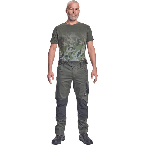 • férfi munkanadrág innovatív rugalmas Trifibetex® anyagból CORDURA® betétekkel • elöl 2 ékzseb • hátul 2 tépőzáras foltzseb • bal oldalon nagy multifunkciós zseb • jobb oldalon multifunkciós zseb vonalzónak • kés- és ceruzatartó • fém "D" gyűrű • rugalmas derék• hosszabbítható szárak • fényvisszavető részletek • dekoratív tripla tűzés kontrasztos színnel • kalapácstartó