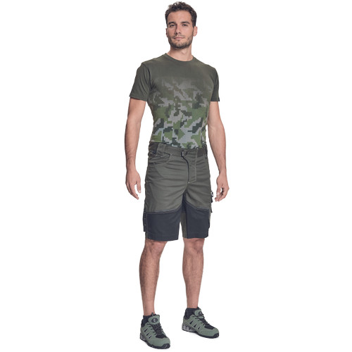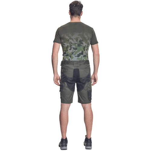 • férfi rövidnadrág innovatív, rugalmas Trifibetex® anyagból • 2 ékzseb • hátul 2 tépőzáras foltzseb • bal oldalon nagy multifunkciós zseb • jobb oldalon multifunkciós zseb vonalzónak • kés- és ceruzatartó • fém "D" gyűrű • rugalmas derék • fényvisszavető részletek • dekoratív tripla varrás kontrasztos színnel • kalapácstartó