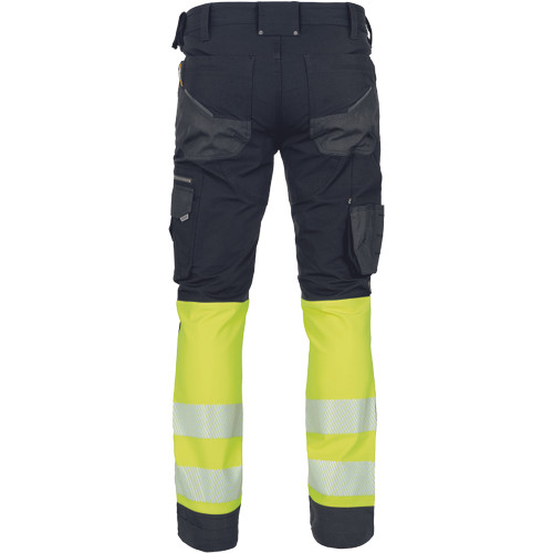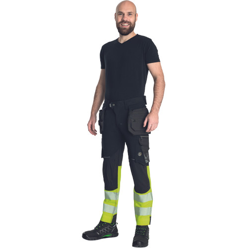 Férfi HI-VIS munkanadrág egyedi négyirányú stretch anyagokból, Trifibetex-PRO® és Trifibetex-VIS® alapanyagból, melyet 2 oldalsó, eltávolítható, multifunkcionális lengőzseb egészít ki • 2 elülső ékzseb • 2 hátsó felvarrt zseb tépőzárral • 2 multifunkcionális combzseb • CORDURA® megerősítés a térdrészen, opcionális térdvédő behelyezési lehetőséggel • tartós hármas varrás a szárakon és az üleprészen• patentos derék • 7,5 cm széles nyomtatott és szegmentált fényvisszavető csíkok az alsó szárakon • rugalmas derék • állítható lábhossz • színben harmonizáló fényvisszavető részletek.