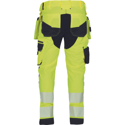 Férfi HI-VIS munkanadrág egyedi négyirányú stretch anyagból, Trifibetex-VIS® alapanyagból, melyet 2 eltávolítható, multifunkcionális lengőzseb egészít ki • 2 elülső ékzseb • 2 hátsó felvarrt zseb tépőzárral • nagy multifunkcionális zseb a bal combon • jobb combon multifunkcionális zseb kés és mérőeszközök tárolására • CORDURA® megerősítés a térdrészen, opcionális térdvédő behelyezési lehetőséggel • tartós hármas varrás a szárakon és az üleprészen• rugalmas derék • állítható lábhossz • 7,5 cm széles nyomtatott és szegmentált fényvisszavető csíkok • színben harmonizáló fényvisszavető részletek
