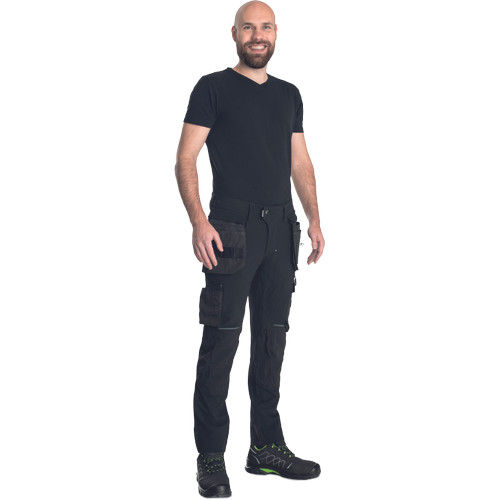 • férfi munkanadrág egyedi négyirányú stretch anyagból, Trifibetex-PRO® alapanyagból, melyet 2 eltávolítható, multifunkcionális lengőzseb egészít ki • 2 elülső ékzseb • 2 hátsó felvarrt zseb tépőzárral• bal combon nagy multifunkcionális zseb • multifunkcionális vonalzó- és kés tároló zsebek a jobb combon • CORDURA® megerősítés a térdrészen, opcionális térdvédő behelyezési lehetőséggel • tartós hármas varrás a szárakon és az üleprészen• rugalmas derék • állítható lábhossz • színben harmonizáló fényvisszavető részletek.