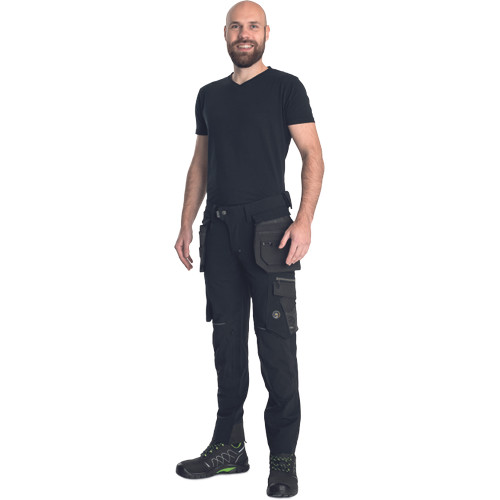 • férfi munkanadrág egyedi négyirányú stretch anyagból, Trifibetex-PRO® alapanyagból, melyet 2 eltávolítható, multifunkcionális lengőzseb egészít ki • 2 elülső ékzseb • 2 hátsó felvarrt zseb tépőzárral• bal combon nagy multifunkcionális zseb • multifunkcionális vonalzó- és kés tároló zsebek a jobb combon • CORDURA® megerősítés a térdrészen, opcionális térdvédő behelyezési lehetőséggel • tartós hármas varrás a szárakon és az üleprészen• rugalmas derék • állítható lábhossz • színben harmonizáló fényvisszavető részletek.