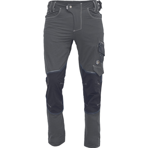 férfi munkanadrág innovatív, rugalmas TRIFIBETEX PRO® anyagból, elöl 2 ékzseb, hátul 2 tépőzáras foltzseb, bal oldalt nagy multifunkciós zseb, jobb oldalt multifunkciós vonalzó, kés és ceruzatartó, fém "D" gyűrű, rugalmas derék, hosszabbítható szárhossz, fényvisszavető elemek, dekoratív tripla varrás kontrasztos színnel, kalapácstartó