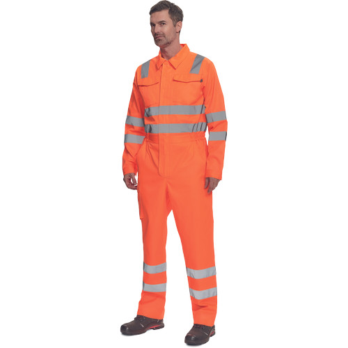 • férfi Hi-Vis overall 5 cm széles fényvisszavető csíkokkal • hajtókával fedett cipzár • 2 első zseb, 1 érmezseb • 1 multifunkciós oldalzseb a száron • 2 hátsó zseb • 2 zsebfedős mellzseb • rugalmas betét a derékrészen • leengedhető szárak