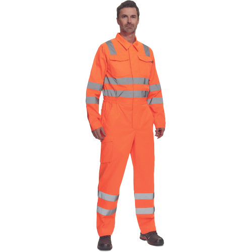 • férfi Hi-Vis overall 5 cm széles fényvisszavető csíkokkal • hajtókával fedett cipzár • 2 első zseb, 1 érmezseb • 1 multifunkciós oldalzseb a száron • 2 hátsó zseb • 2 zsebfedős mellzseb • rugalmas betét a derékrészen • leengedhető szárak