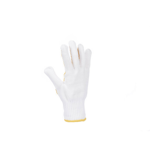 • kötött varrat nélküli kesztyű nylon és üvegszál keverékből, sárga PVC pöttyökkel a tenyéren és az ujjakon • C szintű vágásbiztonság