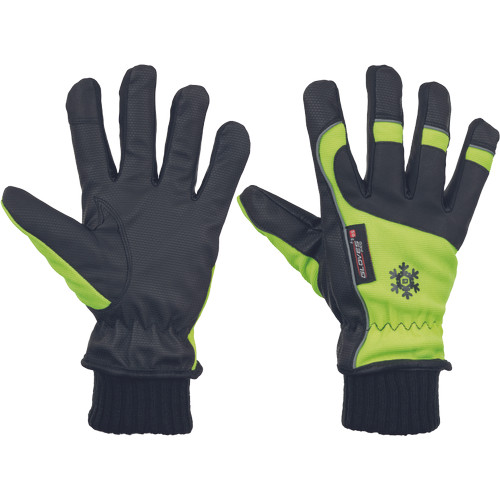 • téli védőkesztyű figyelemfelkeltő, rugalmas nylon textillel a kézfejen és a hüvelykujj alsó részén • fényvisszavető szegélyek a kézfejen és ujjakon • kötött mandzsetta • Domborított PU tenyér és körömvédők • biztos fogás