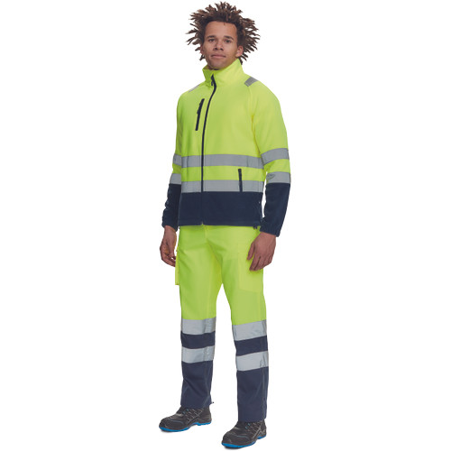 • Hi-Vis férfi polár pulóver 5 cm széles fényvisszavető csíkokkal • cipzáras kivitelben • 1 mellkasi és 2 cipzáras oldalzseb • rugalmas mandzsetták, a pulóver alja húzózsinórral szűkíthető
