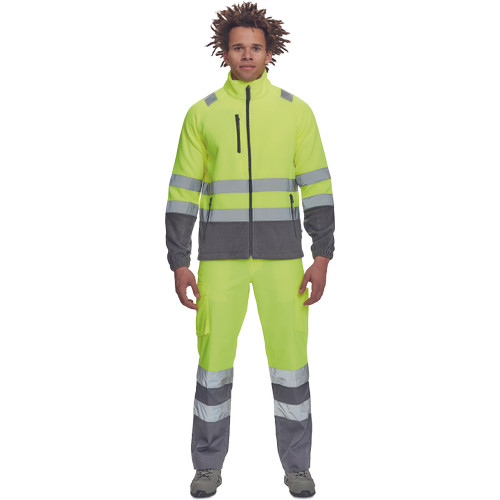 • Hi-Vis férfi polár pulóver 5 cm széles fényvisszavető csíkokkal • cipzáras kivitelben • 1 mellkasi és 2 cipzáras oldalzseb • rugalmas mandzsetták, a pulóver alja húzózsinórral szűkíthető