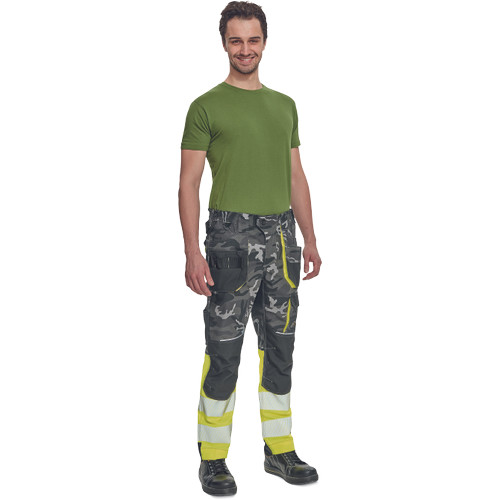 • férfi jólláthatósági nadrág rugalmas derékkal és többfunkciós zsebekkel, fényvisszavető elemekkel és 7 cm-es szegmentált fényvisszavető csíkokkal • megerősített térdrész és térdzseb Oxford 600D anyagból térdvédő behelyezéséhez • ellenálló hármas fedőző varrás az üleprészen és a meghosszabítható szárakon • modern terepminta