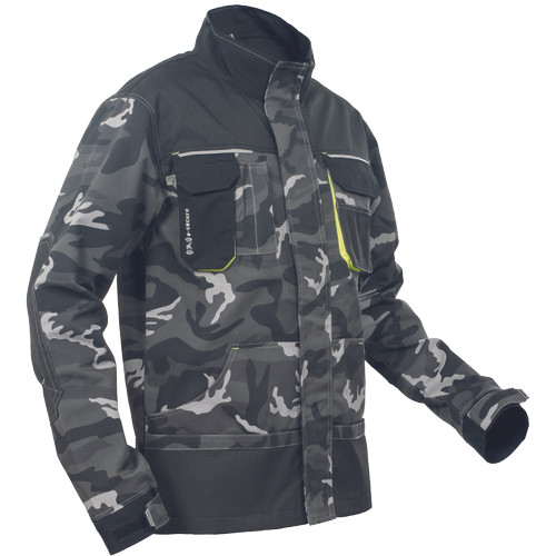 • férfi munkakabát • cipzárral záródó kabát tépőzáras hajtókával • Oxford 600D megerősítő rátétekkel a váll-és könyökrészeken • 2-2 oldal - és mellzsebbel, 1 e-Secure anyagból készült telefontartó zsebbel • fényvisszavető elemek, kontrasztos tűzés • modern terepminta