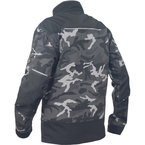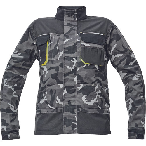 • férfi munkakabát • cipzárral záródó kabát tépőzáras hajtókával • Oxford 600D megerősítő rátétekkel a váll-és könyökrészeken • 2-2 oldal - és mellzsebbel, 1 e-Secure anyagból készült telefontartó zsebbel • fényvisszavető elemek, kontrasztos tűzés • modern terepminta