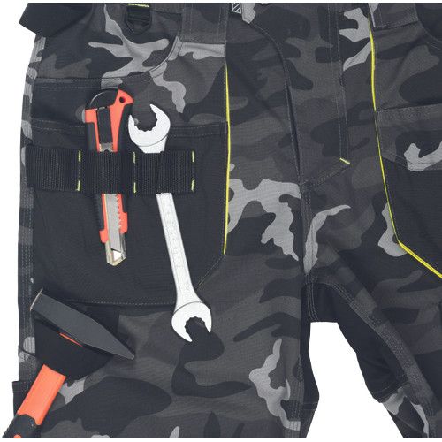 • férfi nadrág rugalmas derékkal és többfunkciós zsebekkel • megerősített térdrész és térdzseb Oxford 600D anyagból térdvédő behelyezéséhez • ellenálló hármas fedőző varrás az üleprészen és a meghosszabítható szárakon • modern terepmintával