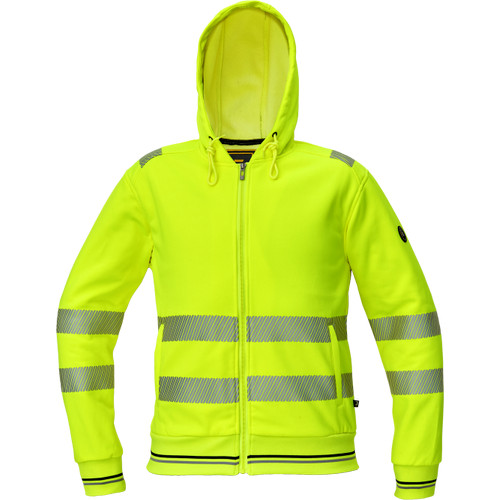 • kevertszálas jólláthatósági kapucnis kardigán cipzárral • 2 db 5 cm-es szegmentált fényvisszavető csíkkal a derékrészen, az ujjakon és a vállakon • bolyhosodásmentes francia frottír szövet belső, kétrétegű kapucni, dekoratív tűzések • rugalmas mandzsetta és alsó szegély
