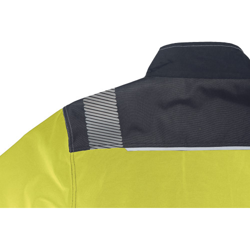 • férfi jólláthatósági munkakabát • cipzárral záródó kialakítás tépőzáras hajtókával, Oxford 600D megerősítő rátétekkel a váll-és könyökrészeken • 2-2 oldal - és mellzsebbel, 1 e-Secure anyagból készült telefontartó zsebbel • fényvisszavető részletekkel • 5 cm -es fényvisszavető csíkokkal a derékrészen, az ujjakon és a vállakon