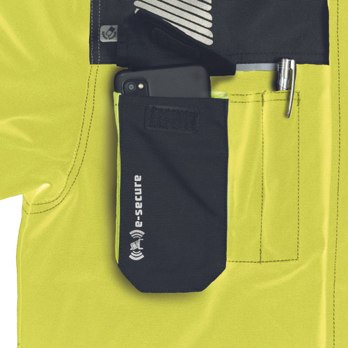 • férfi jólláthatósági munkakabát • cipzárral záródó kialakítás tépőzáras hajtókával, Oxford 600D megerősítő rátétekkel a váll-és könyökrészeken • 2-2 oldal - és mellzsebbel, 1 e-Secure anyagból készült telefontartó zsebbel • fényvisszavető részletekkel • 5 cm -es fényvisszavető csíkokkal a derékrészen, az ujjakon és a vállakon