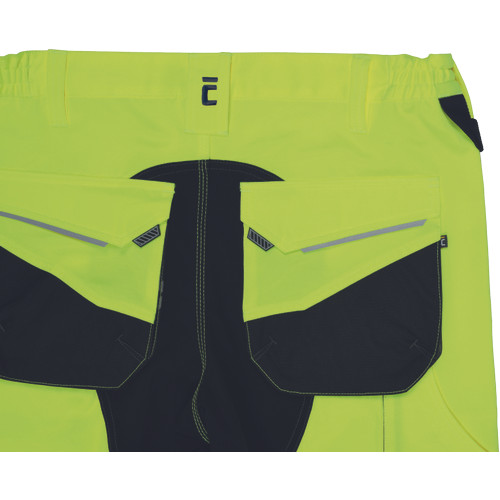 • férfi jólláthatósági nadrág rugalmas derékkal és többfunkciós zsebekkel, 7 cm-es nyomtatott fényvisszavető csíkokkal • megerősített térdrész és térdzseb Oxford 600D anyagból térdvédő behelyezéséhez • ellenálló hármas fedőző varrás az üleprészen és a meghosszabbítható szárakon